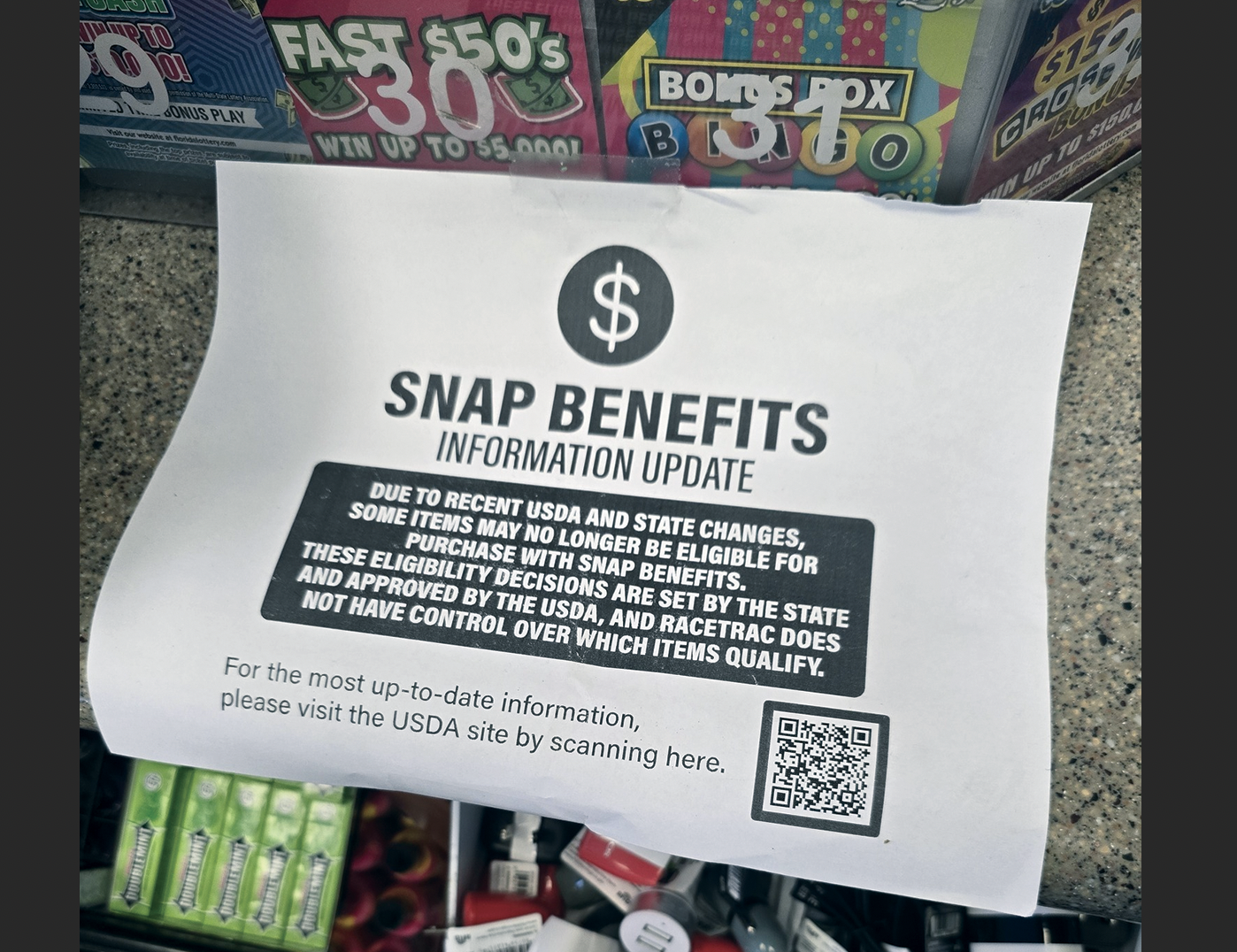 A printed notice taped to the counter at the Belleview RaceTrac is catching attention, and sparking debate. The sign, labeled “SNAP Benefits Information Update,” warns customers that some items may no longer be eligible for purchase with Supplemental Nutrition Assistance Program benefits.